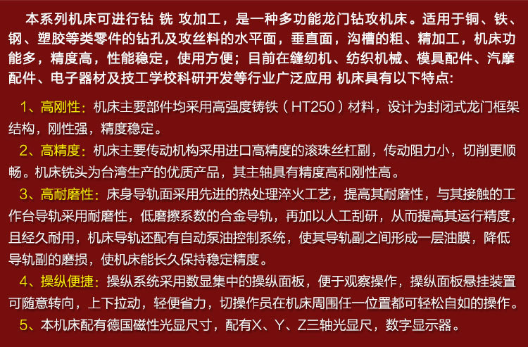 龍門數(shù)控鉆銑床系列主要用于平板、法蘭、盤類、環(huán)件等厚度在有效范圍內(nèi)工件的高效鉆孔加工??稍趩钨|(zhì)材料零件及復(fù)合材料上實現(xiàn)鉆通孔,盲孔。機床加工過程數(shù)字控制,操作十分方便。能實現(xiàn)自動化、高精度、多品種、大批量生產(chǎn)。 本設(shè)備為高速龍門數(shù)控鉆銑床,加工效率為普通麻花鉆3-5倍,主軸內(nèi)出水,可使用內(nèi)冷刀具鉆孔。 可選配液壓卡盤,專為法蘭鉆孔設(shè)計,效率快,精度高,1米以內(nèi)直徑法蘭首選。 有效加工尺寸:1米*1米。鉆孔范圍:1mm ~40mm。